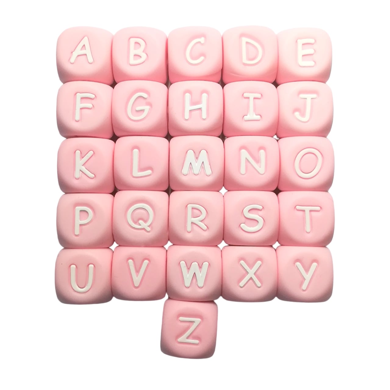 Je 1 Buchstabe   |   rosa mit weißen, geprägten Buchstaben   |   12 x 12 mm, Fädelloch ca. 2 mm   |   Material: Silikon