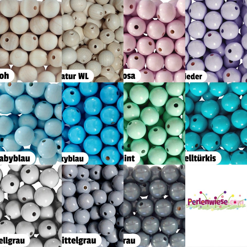 1 Päckchen = ca. 22 Stk. | Ø ca. 15 mm, Bohrung ca. 3 mm | Auffädellänge eines Päckchens ca. 32 cm | Material: Ahornholz