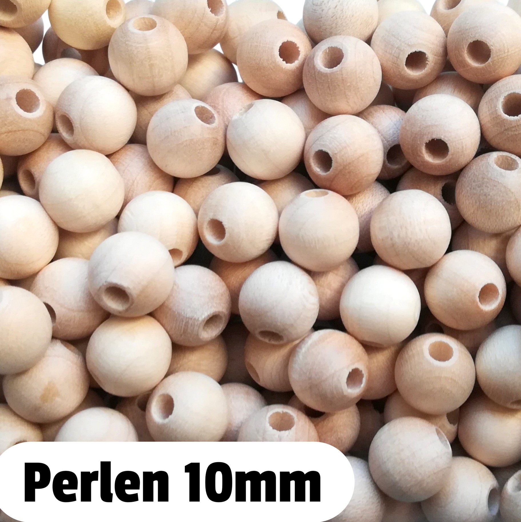 1 Päckchen = ca. 60 Stk. | Ø ca. 10 mm, Bohrung ca. 3 mm | Auffädellänge eines Päckchens ca. 59 cm | Material: Ahornholz