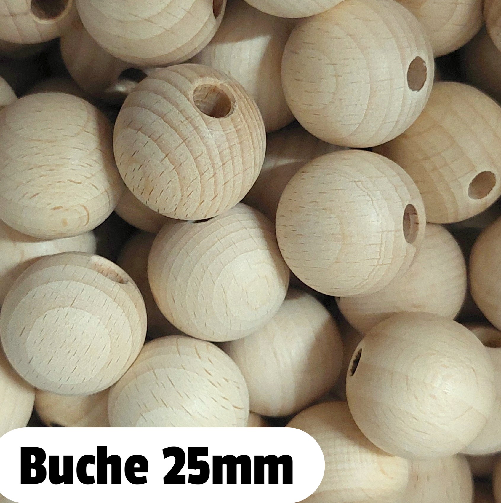 1 Päckchen = ca. 5 Stk. | Ø ca. 25 mm, Bohrung ca. 4 mm | Auffädellänge eines Päckchens ca. 11 cm | Material: Buchenholz